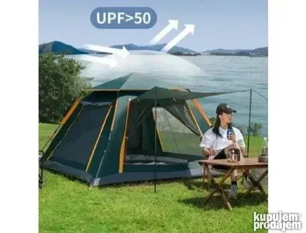 Jednostavno podešavanjeNajnapredniji prenosivi šator ima revolucionarniji dizajn od običnog šatora. Instant pop-up šator sa unapred montiranim stubovima postavlja se za nekoliko sekundi, jednostavno otvorite torbu i otpustite je, lako i efikasno postavite vodootporni šator, omogućavajući vam da u potpunosti uživate u odmoru na otvorenom. Čak i ako iznenada padne kiša. . . Sa ukupnom težinom od 4,5 kg ovaj šator za 4 osobe je lak za nošenje bilo gde, pogodan za opušteno kampovanje, opuštanje u dvorištu, festivale, rekreaciju na otvorenom, izviđanje dečaka i devojčica, ruksak i druženja na plaži. Takođe dolazi sa prostirkom otpornom na vlagu, dvostrukom zaštitom za vaše kampovanje.