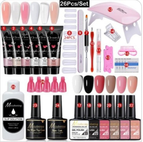 Deluxe set za nokte sa 26 delova čine gelovi boja, UV/LED lampa, osnovni i završni gel, alat za manikir, ukrasi za nokte, šabloni, četkice, turpije, i još mnogo toga. Luksuzni set “Poly Nail” zadovoljiće sve naše potrebe, bilo da se radi o kućnoj nezi noktiju ili profesionalnom salonu za manikir i pedikir.